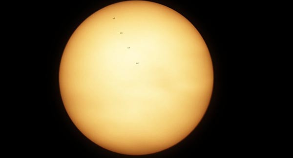 Las imágenes, hechas por el fotógrafo de la NASA Joel Kowsky, muestran al objeto artificial más grande en la órbita de nuestro planeta que parece peque?o cuando pasa frente al sol.