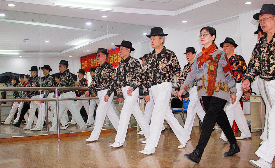Un grupo de hombres chinos cuya edad promedio es de 68 a?os participan de un curso de modelado de ropa en un colegio para el adulto mayor en Wuhan, provincia de Hubei. [Foto: proporcionada]