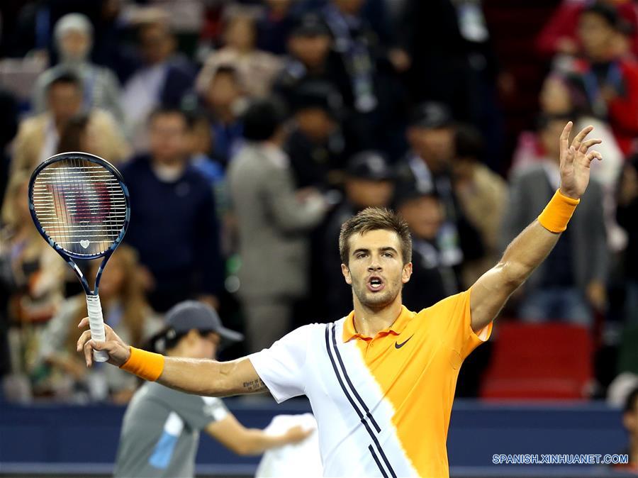 Borna Coric, de Croacia, festeja al término del partido individual varonil de semifinal del torneo de tenis Maestros de Shanghai de la Asociación de Tenistas Profesionales (ATP), ante Roger Federer, de Suiza, en Shanghai, en el este de China, el 13 de octubre de 2018. (Xinhua/Fan Jun)