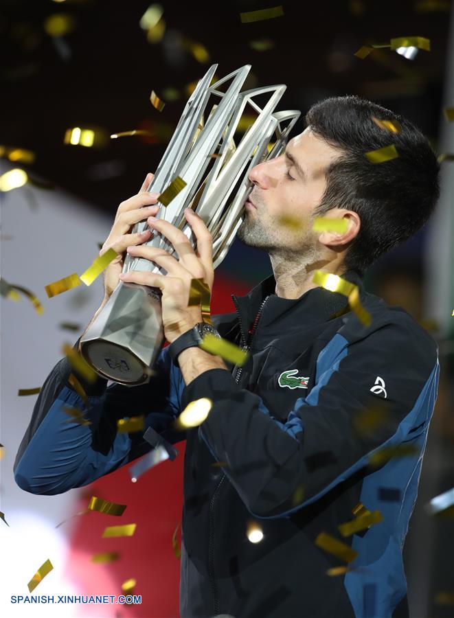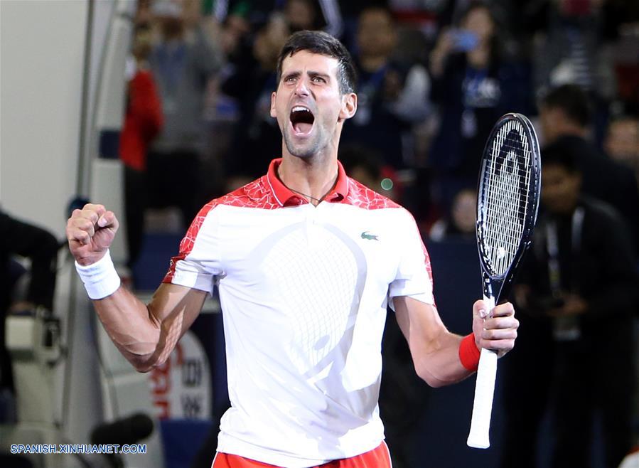 SHANGHAI, octubre 14, 2018 (Xinhua) -- Novak Djokovic, de Serbia, celebra luego de ganar la final individual varonil del torneo de tenis Maestros de Shanghai de la Asociación de Tenistas Profesionales (ATP), ante Borna Coric, de Croacia,en Shanghai, en el este de China, el 14 de octubre de 2018. (Xinhua/Fan Jun)
