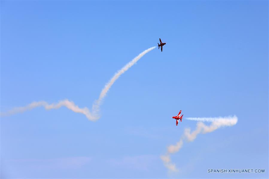 Aviones de aeromodelismo con motores de reacción realizan acrobacias en el aire durante un concurso llevado a cabo en Rongcheng, provincia de Shandong, en el este de China, el 13 de octubre de 2018. Un total de 12 equipos de todo el mundo compiten en el aire. (Xinhua/Lin Haizhen)