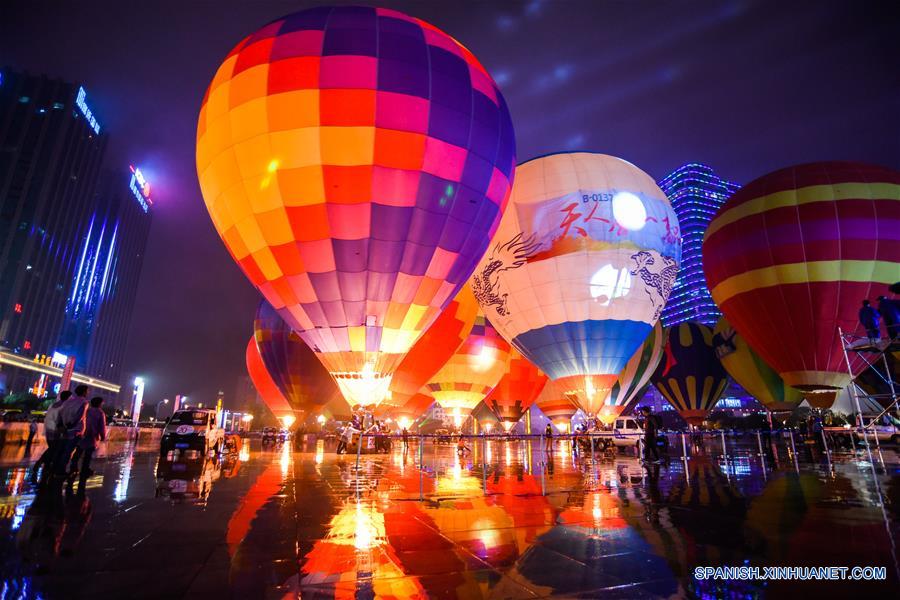 Imagen del 14 de octubre de 2018 de personas observando coloridos globos aerostáticos en la plaza Jushan de la ciudad de Xingyi, provincia de Guizhou, en el suroeste de China. (Xinhua/Liu Chaofu)