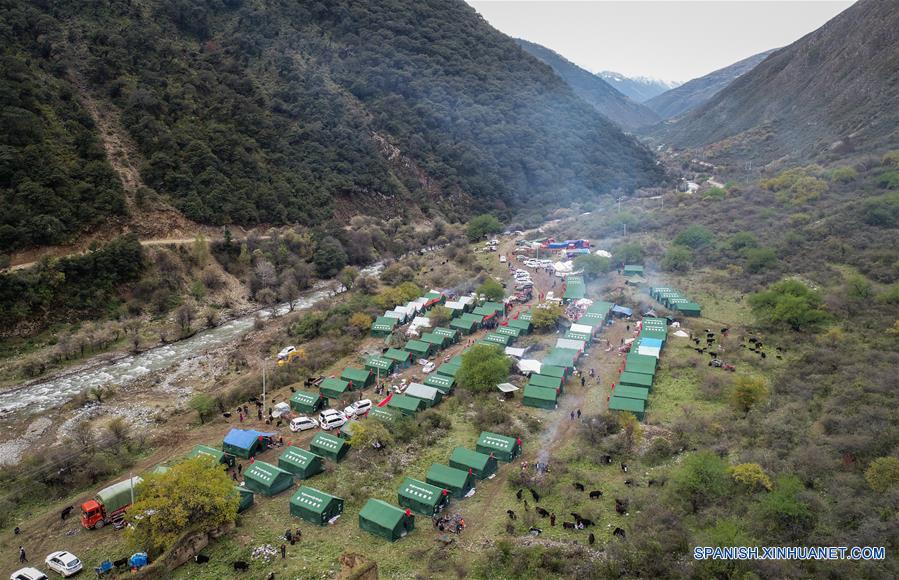 Imagen aérea del 14 de octubre de 2018 de la vista de un asentamiento temporal en el municipio Bolo del condado de Jomda en Qamdo, región autónoma del Tíbet, en el suroeste de China. El nivel del agua de un lago de barrera formado por un desprendimiento de tierras en una sección del río Jinsha, en el suroeste de China, volvió a la normalidad el domingo en la noche sin que se hayan reportado víctimas, dijeron las autoridades. (Xinhua/Liu Dongjun)