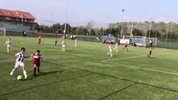 En el segundo de ellos, el chaval se va de su par por velocidad para después batir al portero rival con un tiro cruzado, pero es en el primero en el que más talento muestra, al zafarse de su marcador con un preciso toque por detrás de su cuerpo para después internarse en el área y atacar la portería.