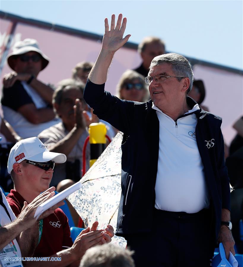 BUENOS AIRES, octubre 16, 2018 (Xinhua) -- El presidente del Comité Olímpico Internacional (COI), Thomas Bach, saluda a los espectadores durante la competencia femenil individual de tiro con arco recurvo de los Juegos Olímpicos de la Juventud Buenos Aires 2018, en Buenos Aires, Argentina, el 16 de octubre de 2018. (Xinhua/Wang Lili)