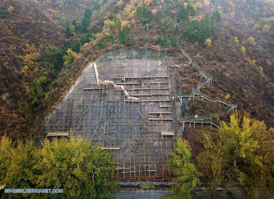 BEIJING, octubre 16, 2018 (Xinhua) -- Imagen del 15 de octubre de 2018 de una vista aérea de expertos trabajando en un proyecto de conservación de una huella de dinosaurio, en el Geoparque Global de Yanqing, en el distrito Yanqing de Beijing, capital de China. Expertos procedentes de China y Grecia han iniciado recientemente su primer trabajo de conservación conjunta en las huellas de dinosaurio fosilizadas en Yanqing para prevenirlas del da?o por el clima. Se cree que las huellas fueron dejadas por dinosaurios hace aproximadamente 150 millones de a?os. (Xinhua/Luo Xiaoguang)
