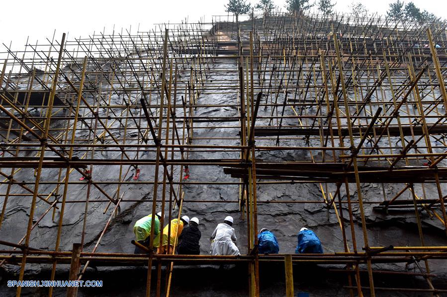BEIJING, octubre 16, 2018 (Xinhua) -- Imagen del 15 de octubre de 2018 de expertos trabajando en un proyecto de conservación de una huella de dinosaurio, en el Geoparque Global de Yanqing, en el distrito Yanqing de Beijing, capital de China. Expertos procedentes de China y Grecia han iniciado recientemente su primer trabajo de conservación conjunta en las huellas de dinosaurio fosilizadas en Yanqing para prevenirlas del da?o por el clima. Se cree que las huellas fueron dejadas por dinosaurios hace aproximadamente 150 millones de a?os. (Xinhua/Luo Xiaoguang)