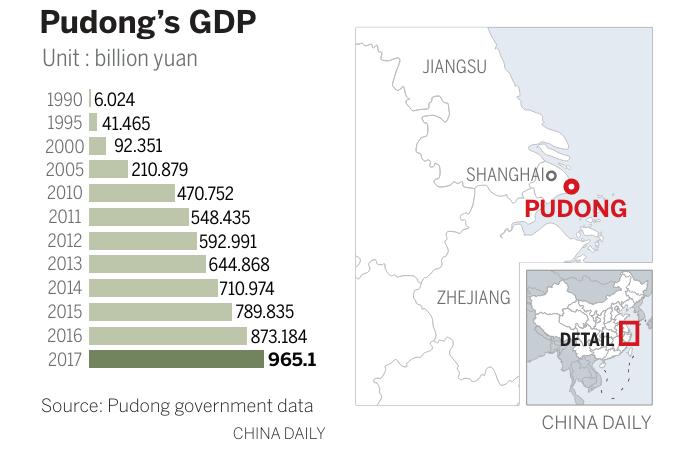 El a?o pasado, el PIB de la nueva área de Pudong llegó a los 965,1 mil millones de renminbi, desde los discretos 6 mil millones de renminbi del a?o 90. Su ingreso disponible per cápita fue de 60.715 renminbi, una cifra más alta que los 58.988 renminbi promedios de Shanghai.