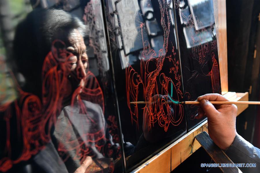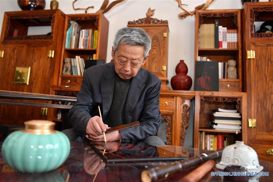 SHANXI, octubre 17, 2018 (Xinhua) -- Imagen del 16 de octubre de 2018 del artesano Geng Baoguo poniendo colores sobre un objeto de laca en su taller, en Pingyao, provincia de Shanxi, en el norte de China. Los lacados son objetos decorativos cubiertos de laca. El barnizado de los objetos de laca en Pingyao está hecho con laca natural y se utiliza una técnica especial manual. Después de varios pasos de técnicas artesanales, son decorados con varios patrones coloridos y se les instalan adornos. La superficie terminada de los objetos lacados es lisa y lustrosa. Teniendo una historia de más de 1,000 a?os el lacado de Pingyao fue catalogado como un patrimonio nacional cultural intangible de China en 2006. (Xinhua/Cao Yang)