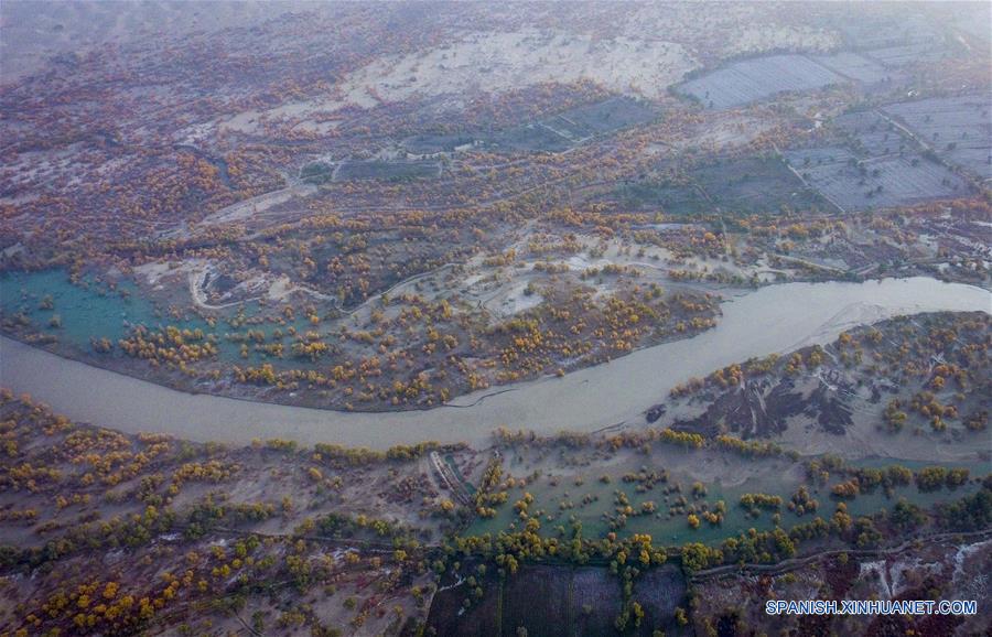 XINJIANG, octubre 17, 2018 (Xinhua) -- Imagen del 16 de octubre de 2018 de una vista aérea del paisaje de los bosques de álamos de Eufrates, en el condado de Yuli, en la Región Autónoma Uygur de Xinjiang, en el noroeste de China. La villa Lop Nur depende básicamente de la pesca para su sustento y han desarrollado una cultura distinta basada en su especial estilo de vida. Ubicada en la cuenca del Tarim, Yuli es conocida por su paisaje natural y cultura étnica y continua atrayendo a numerosos turistas locales y extranjeros. Del 1 al 15 de octubre de 2018, el condado de Yuli ha recibido más de 230,000 visitantes, con un incremento interanual de 31.46 por ciento. (Xinhua/Zhao Ge)