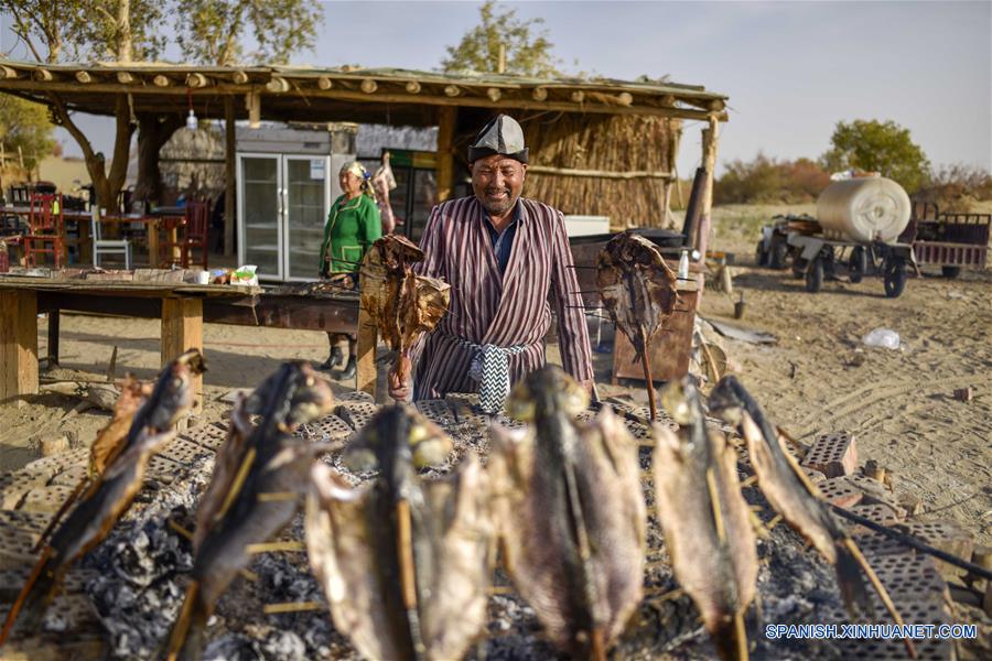 XINJIANG, octubre 17, 2018 (Xinhua) -- Imagen del 16 de octubre de 2018 de un residente elaborando pescado rostizado en la villa Lop Nur del condado de Yuli, en la Región Autónoma Uygur de Xinjiang, en el noroeste de China. La villa Lop Nur depende básicamente de la pesca para su sustento y han desarrollado una cultura distinta basada en su especial estilo de vida. Ubicada en la cuenca del Tarim, Yuli es conocida por su paisaje natural y cultura étnica y continua atrayendo a numerosos turistas locales y extranjeros. Del 1 al 15 de octubre de 2018, el condado de Yuli ha recibido más de 230,000 visitantes, con un incremento interanual de 31.46 por ciento. (Xinhua/Zhao Ge)