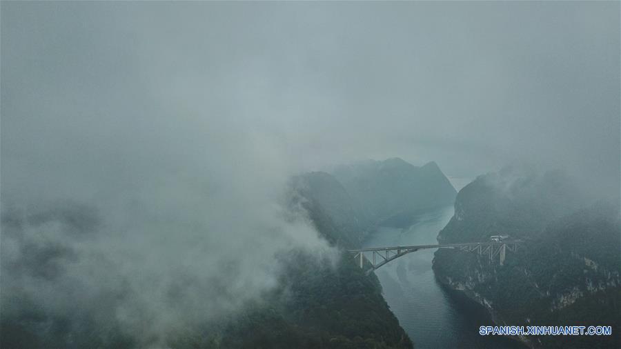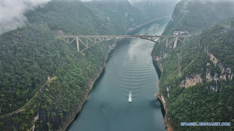 GUIZHOU, octubre 18, 2018 (Xinhua) -- Vista aérea de un puente que cruza el Río Jiangjie, en el condado de Weng'an, provincia de Guizhou, en el suroeste de China, el 18 de octubre de 2018. (Xinhua/Ou Dongqu)