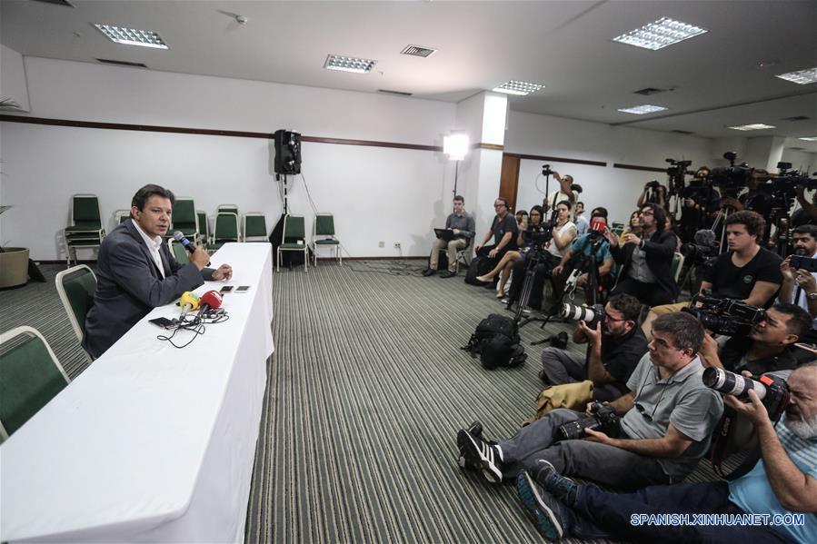 SAO PAULO, octubre 18, 2018 (Xinhua) -- El candidato presidencial por el Partido de los Trabajadores (PT), Fernando Haddad (i), sostiene una conferencia de prensa con representantes de los medios de comunicación internacionales, en Sao Paulo, Brasil, el 18 de octubre de 2018. La segunda vuelta de las elecciones presidenciales de Brasil se llevará a cabo el 28 de octubre. (Xinhua/Rahel Patrasso)