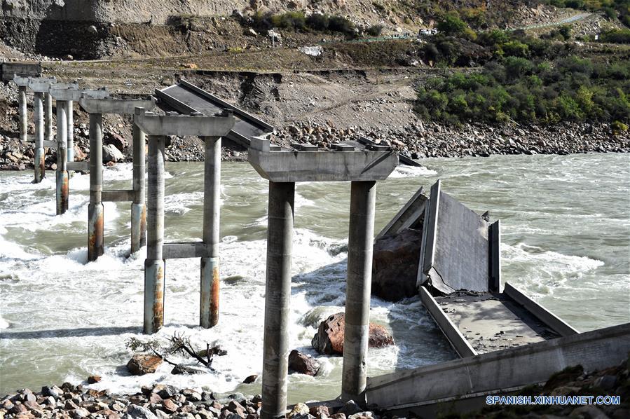 Vista del da?ado puente Dalin por la oleada de agua de un lago de barrera causada por un desprendimiento de tierras en el río Yarlung Tsangp, en el condado de Menling, en la Región Autónoma del Tibet, el 20 de octubre de 2018. El nivel del agua está disminuyendo luego de un desagüe en el lago de barrera que se formó a causa de un desprendimiento de tierras en el río Yarlung Tsangpo en la Región Autónoma del Tibet, en el suroeste de China, se?alaron el viernes funcionarios locales. (Xinhua/Chogo)