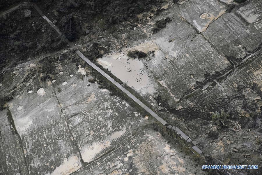 Vista aérea de una carretera hacia la villa de Jiala expuesta después de un desbordamiento de un lago de barrera causado por un desprendimiento de tierras en el río Yarlung Tsangpo, en el condado de Menling, en la Región Autónoma del Tibet, el 20 de octubre de 2018. El nivel del agua está disminuyendo luego de un desagüe en el lago de barrera que se formó a causa de un desprendimiento de tierras en el río Yarlung Tsangpo en la Región Autónoma del Tibet, en el suroeste de China, se?alaron el viernes funcionarios locales. (Xinhua/Purbu Zhaxi)