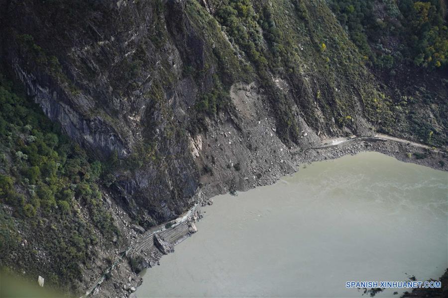 Vista aérea de una carretera da?ada después de un desbordamiento de un lago de barrera causado por un desprendimiento de tierras en el río Yarlung Tsangpo, en el condado de Menling, en la Región Autónoma del Tibet, el 20 de octubre de 2018. El nivel del agua está disminuyendo luego de un desagüe en el lago de barrera que se formó a causa de un desprendimiento de tierras en el río Yarlung Tsangpo en la Región Autónoma del Tibet, en el suroeste de China, se?alaron el viernes funcionarios locales. (Xinhua/Purbu Zhaxi)