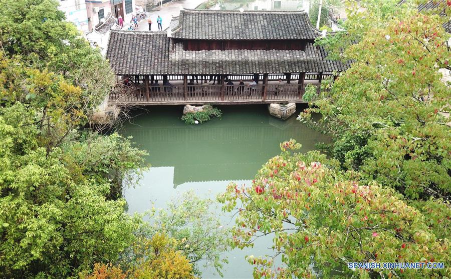 Imagen del 19 de octubre del 2018, de una vista aérea del antiguo Puente Femgui, en la aldea de Chashan de la municipalidad de Chaodong, en el Condado Autónomo Yao de Fuchuan, en la Región Autónoma Zhuang de Guangxi, en el sur de China. Una red de transporte terrreste y por ríos que conectan a las actuales Hunan y la Región Autónoma Zhuang de Guangxi, el Antiguo Camino Xiaohe, prosperó al principios del primer milenio despiés de Cristo, y ha servido por siglos como un importante canal de migración y comercio en el centro y sur del país. Como muchas otras poblaciones a lo largo del Antiguo Camino Xiaohe, el condado de Fuchuan tiene muchos edificios y comunicades historicas. (Xinhua/Zhou Hua)
