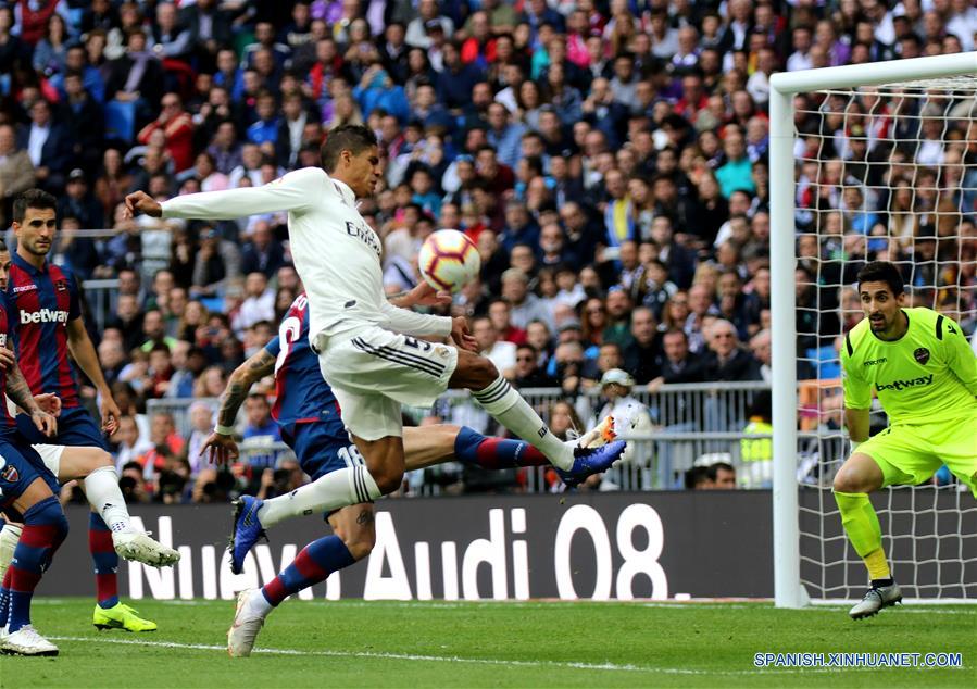 El jugador Raphael Varane (c), de Real Madrid, compite durante el partido correspondiente a la Liga espa?ola, ante Levante, celebrado en Madrid, Espa?a, el 20 de octubre de 2018. Real Madrid perdió el encuentro. (Xinhua/Edward Lopez Peters)