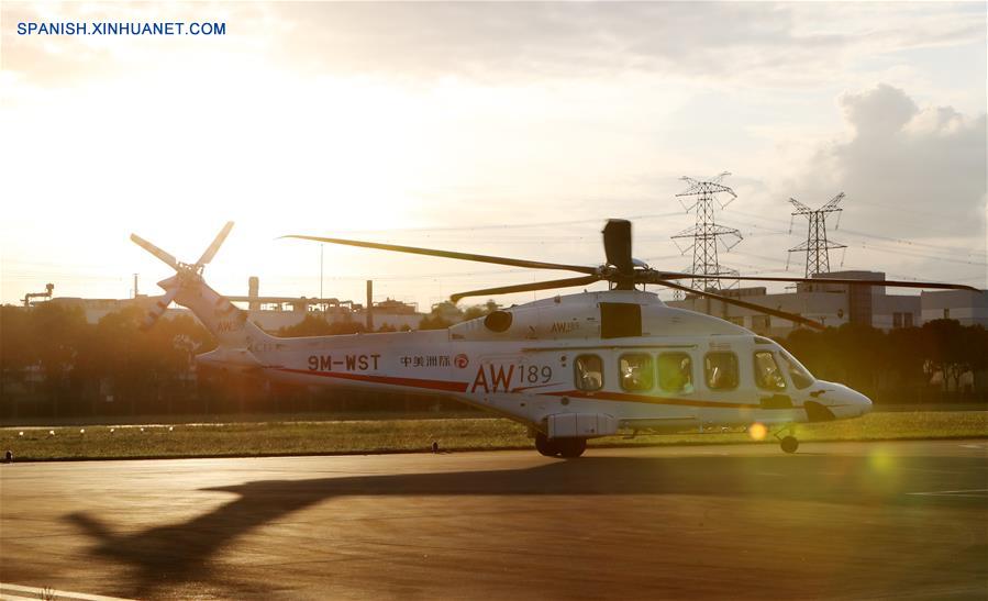 Un helicóptero AW189 fabricado por Leonardo de Italia aterriza en Shanghai, en el este de China, el 20 de octubre de 2018. El helicóptero será exhibido en la Exposición Internacional de Importaciones de China (CIIE, por sus siglas en inglés).