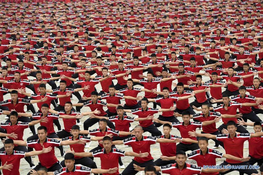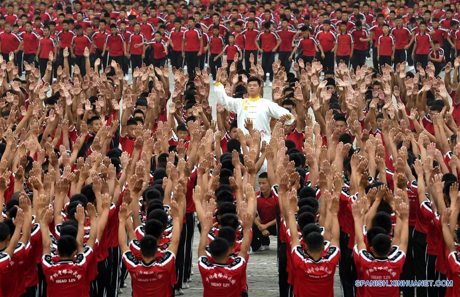 HENAN, octubre 20, 2018 (Xinhua) -- Estudiantes de la Escuela de Artes Marciales Shaolin Tagou realizan la presentación de "Kung Fu Shaolin", en el punto escénico del Templo Shaolin en la ciudad de Dengfeng, en la provincia central de Henan, China, el 20 de octubre de 2018. (Xinhua/Zhu Xiang)