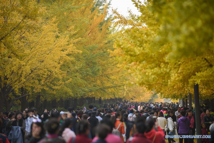 LIAONING, octubre 21, 2018 (Xinhua) -- Personas observan árboles de ginkgo en el campus de la Universidad Agraria de Shenyang, en Shenyang, capital de la provincia de Liaoning, en el noreste de China, el 21 de octubre de 2018. (Xinhua/Long Lei)