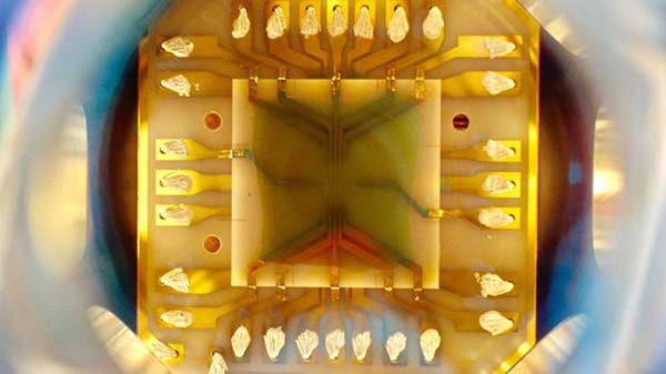 Chip en cuyo interior se ha generado un condensado de Bose-Einstein de 105 átomos. Mide 3x3 centímetros y tiene circuitos de oro - DLR/Proyecto MAIUS, J. Matthias
