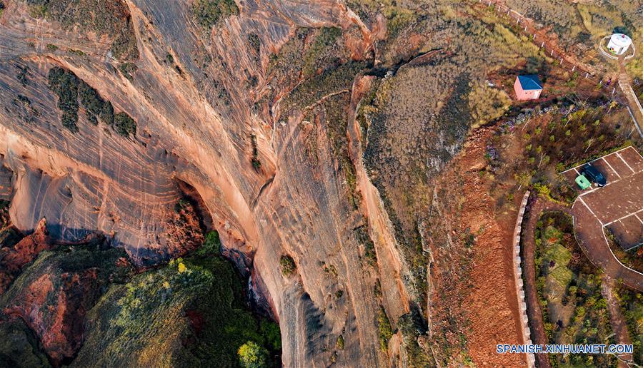 SHAANXI, octubre 22, 2018 (Xinhua) -- Imagen del 21 de octubre de 2018 de una vista aérea del relieve Danxia en Wangjiawan del municipio de Pingqiao, en el distrito Ansai de Yan'an, en la provincia de Shaanxi, en el noroeste de China. El relieve Danxia es un tipo único de geomorfología formada a partir de piedras areniscas rojizas y caracterizada por sus escarpados acantilados. (Xinhua/Tao Ming)