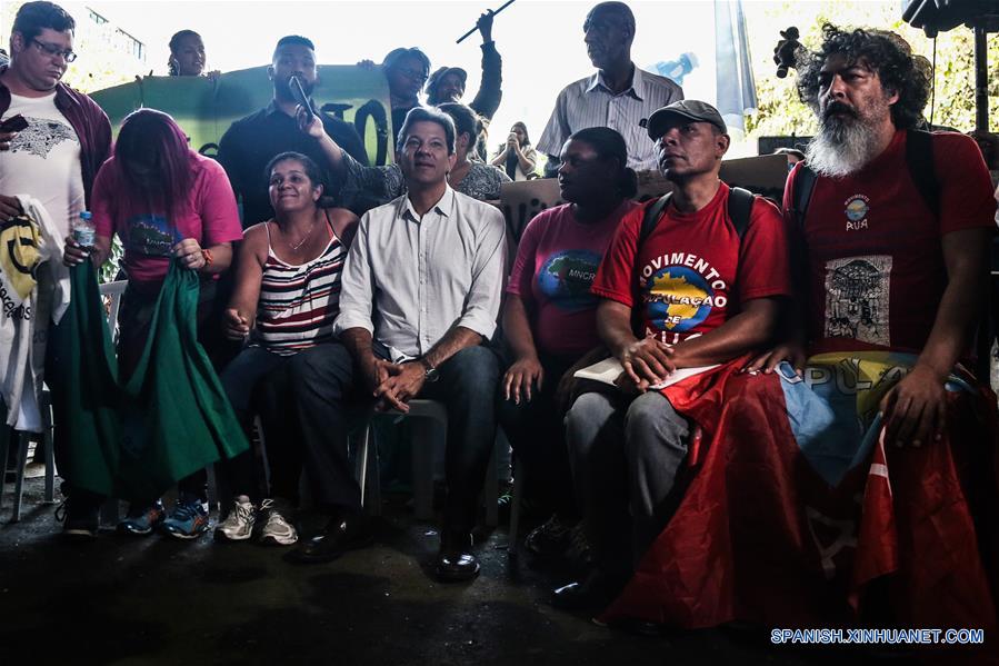 El candidato a la Presidencia de Brasil por el Partido de los Trabajadores (PT), Fernando Haddad (c), asiste a un evento de campa?a con recolectores de deshechos reciclables, en la cooperativa Coopamare, en Sao Paulo, Brasil, el 22 de octubre de 2018. Haddad y Bolsonaro, del Partido Social Liberal (PSL), se disputarán la presidencia de Brasil el próximo domingo 28 de octubre, tras ser los dos más votados en la primera vuelta, el pasado día 7. Bolsonaro logró entonces el 46 por ciento de los sufragios, y Haddad, el 29.2 por ciento. (Xinhua/Rahel Patrasso)