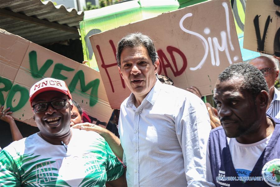 El candidato a la Presidencia de Brasil por el Partido de los Trabajadores (PT), Fernando Haddad (c), asiste a un evento de campa?a con recolectores de deshechos reciclables, en la cooperativa Coopamare, en Sao Paulo, Brasil, el 22 de octubre de 2018. Haddad y Bolsonaro, del Partido Social Liberal (PSL), se disputarán la presidencia de Brasil el próximo domingo 28 de octubre, tras ser los dos más votados en la primera vuelta, el pasado día 7. Bolsonaro logró entonces el 46 por ciento de los sufragios, y Haddad, el 29.2 por ciento. (Xinhua/Rahel Patrasso)