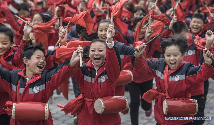 SHAANXI, octubre 23, 2018 (Xinhua) -- Imagen del 22 de octubre de 2018 de estudiantes de primaria aprendiendo el baile del tambor de cintura de Ansai, en el distrito de Ansai de la ciudad de Yan'an, provincia de Shaanxi, en el noroeste de China. En los últimos a?os, las escuelas de Ansai trajeron las artes populares a las clases para popularizar la cultura local. (Xinhua/Tao Ming)