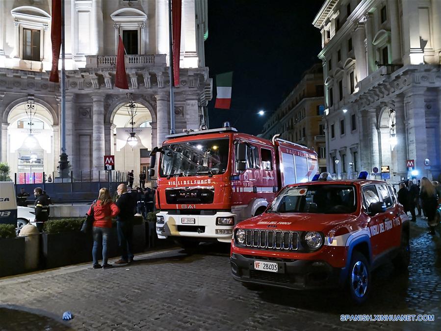 ROMA, octubre 23, 2018 (Xinhua) -- Vehículos de bomberos permanecen frente a la estación del metro donde una escalera eléctrica colapsó, en Roma, Italia, el 23 de octubre de 2018. Al menos 20 aficionados rusos al fútbol resultaron heridos el martes por la noche cuando la escalera eléctrica de una concurrida estación del metro de Roma colapsó, informaron medios locales. (Xinhua/Chen Zhanjie)
