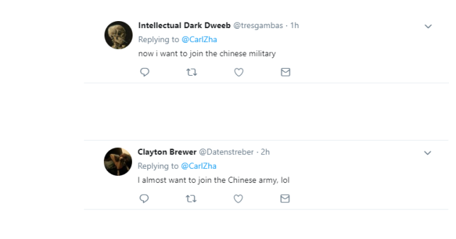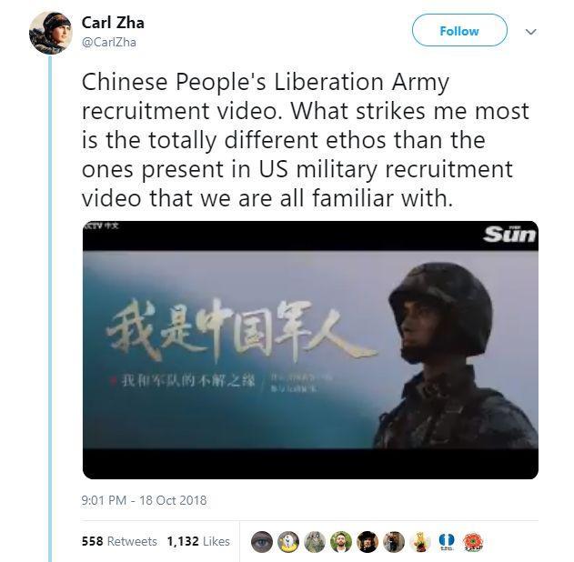 Beijing, 24/10/2018 (El Pueblo en Línea) - El vídeo de reclutamiento, realizado por el Ejército Popular de Liberación de China, se popularizó en Estados Unidos después de que un internauta llamado Carl Zha lo publicara en Twitter el 18 de octubre, informó Global Times.