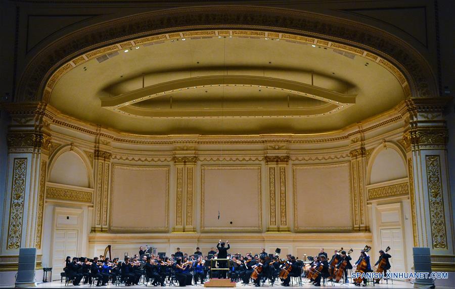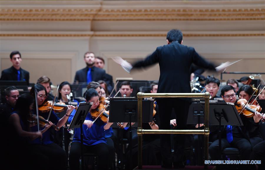 NUEVA YORK, octubre 23, 2018 (Xinhua) -- Imagen del 22 de octubre de 2018 de la Orquesta realizando un concierto de clausura del Festival de Música China Ahora, en el Carnegie Hall en Nueva York, Estados Unidos. La temporada inaugural del Festival de Música China Ahora se llevó a cabo del viernes al lunes en Nueva York con el tema "Enfrentando el Pasado, Mirando Hacia el Futuro: Compositores Chinos en el Siglo XXI". El festival de este a?o consistió en tres conciertos y un panel de discusión. (Xinhua/Li Rui)