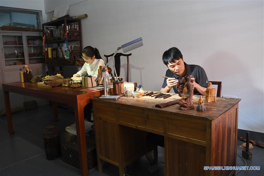 Imagen del 23 de octubre de 2018 del artesano Lin Jianjun (d), y su esposa Chen Qin (i), elaborando piezas de tallado de madera en su estudio en Putian, en la provincia de Fujian, en el sureste de China. Lin Jianjun, quien aprendió tallado de madera a la edad de 16 a?os, ha estudiado la elaboración de su arte tradicional por más de 20 a?os. En 2014, Lin Jianjun se casó con Chen Qin, quien fue influenciada por su esposo y se interesó en el tallado de madera. Ella mejoró el tallado de madera al combinarlo con oro y plata. La pareja trata de promover el tallado de madera de Putian al dar lecciones, instruyendo a aprendices y mostrando sus obras al público. En 2018, Lin Jianjun fue designado como el heredero del tallado de madera, un patrimonio cultural intangible a nivel provincial. (Xinhua/Jiang Kehong)