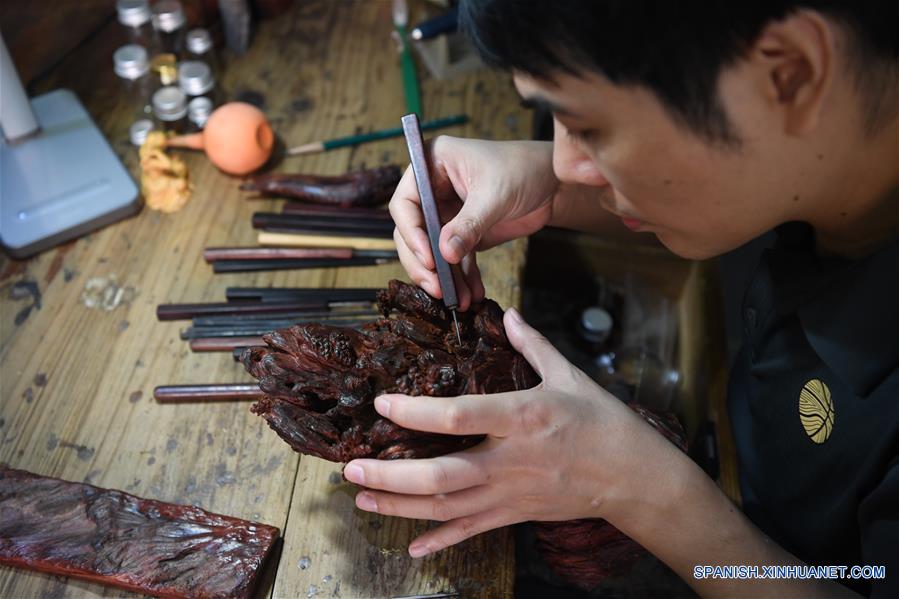 Imagen del 23 de octubre de 2018 del artesano Lin Jianjun, elaborando un tallado de madera en su estudio en Putian, en la provincia de Fujian, en el sureste de China. Lin Jianjun, quien aprendió tallado de madera a la edad de 16 a?os, ha estudiado la elaboración de su arte tradicional por más de 20 a?os. En 2014, Lin Jianjun se casó con Chen Qin, quien fue influenciada por su esposo y se interesó en el tallado de madera. Ella mejoró el tallado de madera al combinarlo con oro y plata. La pareja trata de promover el tallado de madera de Putian al dar lecciones, instruyendo a aprendices y mostrando sus obras al público. En 2018, Lin Jianjun fue designado como el heredero del tallado de madera, un patrimonio cultural intangible a nivel provincial. (Xinhua/Jiang Kehong)