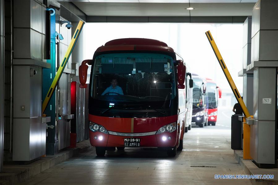 MACAO, octubre 24, 2018 (Xinhua) -- Un autobús de enlace pasa a través del puerto de Macao del puente Hong Kong-Zhuhai-Macao, en Macao, en el sur de China, el 24 de octubre de 2018. El puente Hong Kong-Zhuhai-Macao, el puente marítimo más largo del mundo, abrió oficialmente al tránsito a las 9:00 horas del 24 de octubre. (Xinhua/Cheong Kam Ka)