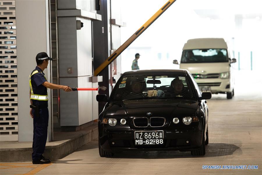 MACAO, octubre 24, 2018 (Xinhua) -- Un automóvil privado transita a través del puerto de Macao del puente Hong Kong-Zhuhai-Macao, en Macao, en el sur de China, el 24 de octubre de 2018. El puente Hong Kong-Zhuhai-Macao, el puente marítimo más largo del mundo, abrió oficialmente al tránsito a las 9:00 horas del 24 de octubre. (Xinhua/Cheong Kam Ka)
