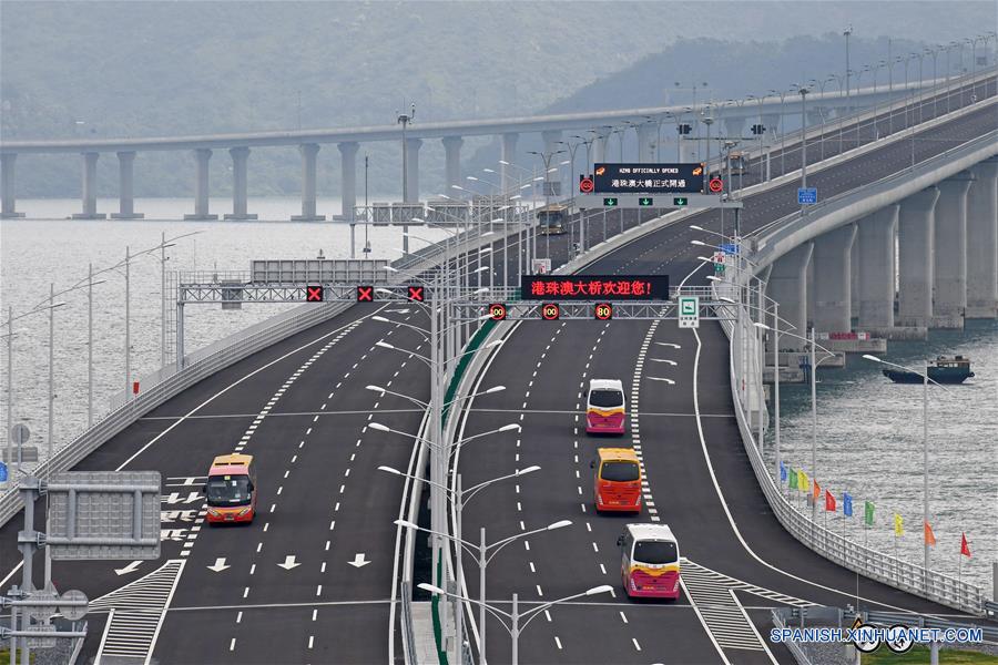 ZHUHAI, octubre 24, 2018 (Xinhua) -- Automóviles transitan sobre el puente Hong Kong-Zhuhai-Macao, el 24 de octubre de 2018. El puente Hong Kong-Zhuhai-Macao, el puente marítimo más largo del mundo, abrió oficialmente al tránsito a las 9:00 horas del 24 de octubre. (Xinhua/Liang Xu)