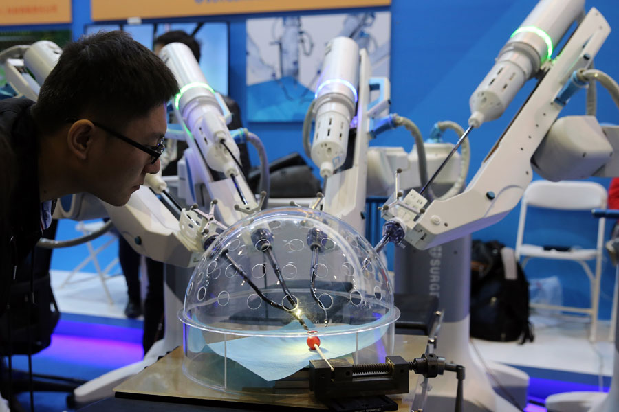 Un robot médico realiza una cirugía simulada durante la inauguración del Festival de Innovación y Emprendimiento de Zhongguancun, Beijing, China. [Foto: Wang Zhuangfei]