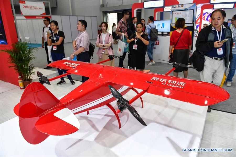 Visitantes observan un dron de energía híbrida para entregas de comercio electrónico durante la Exposición Internet+, en el distrito Shunde de Foshan, en la provincia de Guangdong, en el sur de China, el 24 de octubre de 2018. La cuarta Exposición Internet+ comenzó el miércoles en Guangdong. La exposición de este a?o consiste de seis partes principales respectivamente tecnología de frontera "Internet Plus", Negocios Digitales, Vida Digital, Innovación y Puesta en Marcha, Robótica y Fabricación Inteligente y Robots. La exposición atrae a más de 650 compa?ías alrededor del mundo. (Xinhua/Lu Ye)