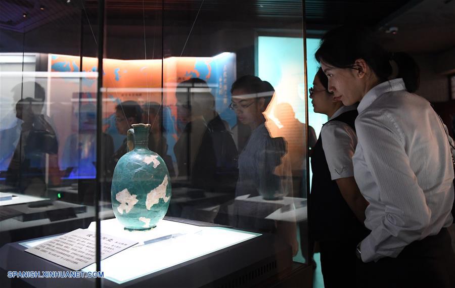 GUANGXI, octubre 25, 2018 (Xinhua) -- Imagen del 23 de octubre de 2018 de visitantes observando una antigüedad que se remonta a la Dinastía Han (202 a.C.-220 d.C.) en el Museo Cultural e Histórico, en Hepu, en la Región Autónoma Zhuang de Guangxi, en el sur de China. (Xinhua/Lu Bo'an)
