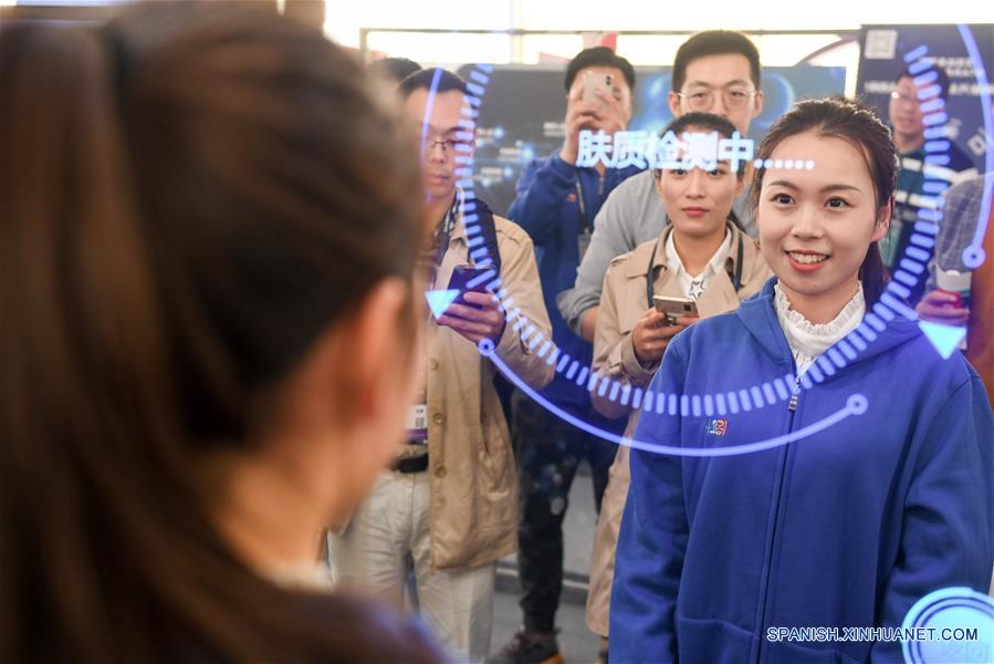 ANHUI, octubre 25, 2018 (Xinhua) -- Imagen del 24 de octubre de 2018 de una mujer experimentando en producto inteligente que puede aplicarse a la industria de la belleza durante la primera Feria Mundial del Sonido, en Hefei, capital de la provincia de Anhui, en el este de China. La primera Feria Mundial del Sonido comenzó el miércoles en Hefei. (Xinhua/Zhang Duan)
