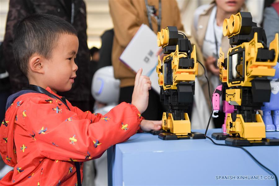 ANHUI, octubre 25, 2018 (Xinhua) -- Imagen del 24 de octubre de 2018 de un ni?o interactuando con un robot educativo durante la primera Feria Mundial del Sonido, en Hefei, capital de la provincia de Anhui, en el este de China. La primera Feria Mundial del Sonido comenzó el miércoles en Hefei. (Xinhua/Zhang Duan)
