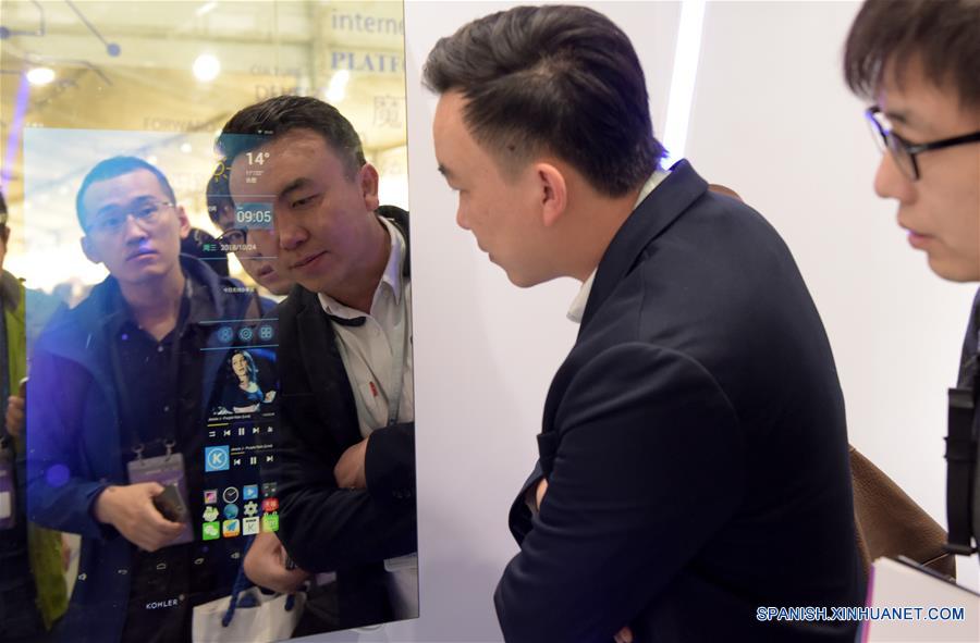 ANHUI, octubre 25, 2018 (Xinhua) -- Imagen del 24 de octubre de 2018 de un hombre experimentando un espejo inteligente durante la primera Feria Mundial del Sonido, en Hefei, capital de la provincia de Anhui, en el este de China. La primera Feria Mundial del Sonido comenzó el miércoles en Hefei. (Xinhua/Guo Chen)