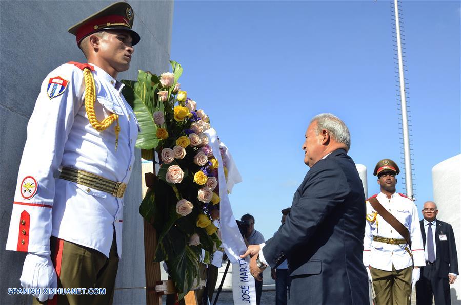 LA HABANA, octubre 25, 2018 (Xinhua) -- El presidente de El Salvador, Salvador Sánchez Cerén (d-frente), deposita una ofrenda floral en el monumento al Héroe Nacional de Cuba, José Martí, en la Plaza de la Revolución en La Habana, Cuba, el 25 de octubre de 2018. El presidente de El Salvador, Salvador Sánchez Cerén, colocó una ofrenda floral al Héroe Nacional de Cuba, José Martí, en el memorial que lleva su nombre en La Habana, capital de Cuba, y posteriormente se reunió con su homólogo cubano, Miguel Díaz-Canel, como parte del programa que el presidente centroamericano lleva a cabo durante su visita a Cuba, y que culminará el próximo sábado, de acuerdo con información de la prensa local. (Xinhua/Joaquín Hernández)