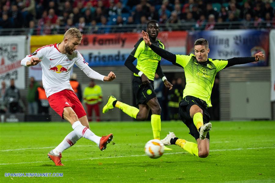 LEIPZIG, octubre 25, 2018 (Xinhua) -- Konrad Laimer (i), de Leipzig, dispara el balón durante un partido del Grupo B de la Liga Europa de la Unión de Asociaciones de Fútbol Europeas (UEFA, por sus siglas en inglés), ante Celtic, en Leipzig, Alemania, el 25 de octubre de 2018. (Xinhua/Kevin Voigt)