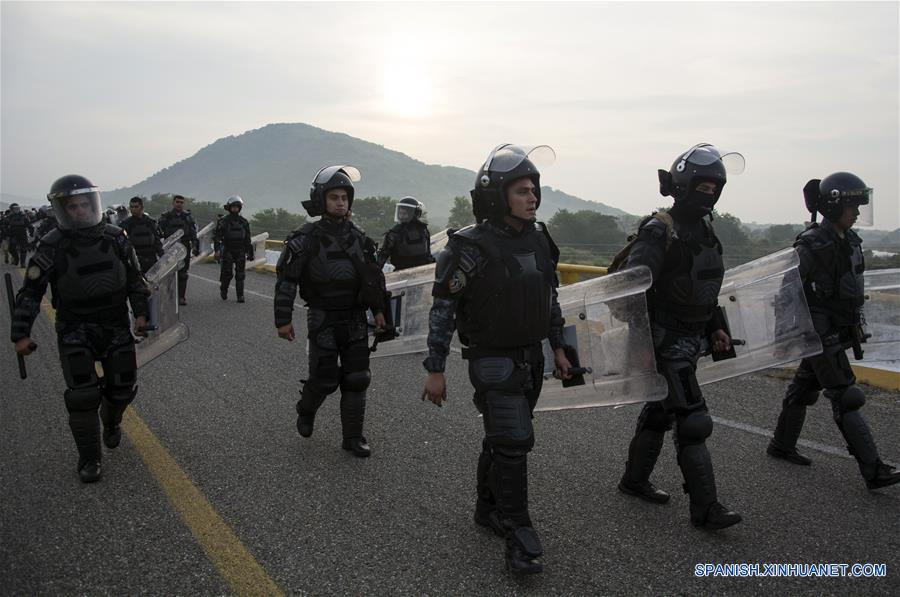 Policías federales mexicanos patrullan mientras la caravana de migrantes realiza su recorrido hacia el estado de Oaxaca en su paso por México, en la ciudad de Arriaga, estado de Chiapas, México, el 27 de octubre de 2018. El gobierno de México ofreció el viernes a los migrantes centroamericanos que se encuentran en el territorio mexicano y que huyen de la crisis social y económica de sus lugares de origen, empleo temporal, servicios de salud y educación a menores de edad. El presidente de México, Enrique Pe?a Nieto, anunció a través de un mensaje en redes sociales el programa "Estás en tu casa", dirigido a los migrantes centroamericanos que "cumplan con las leyes" mexicanas y con la condición de que regularicen su situación migratoria. (Xinhua/Jesús Alvarado Rodríguez)