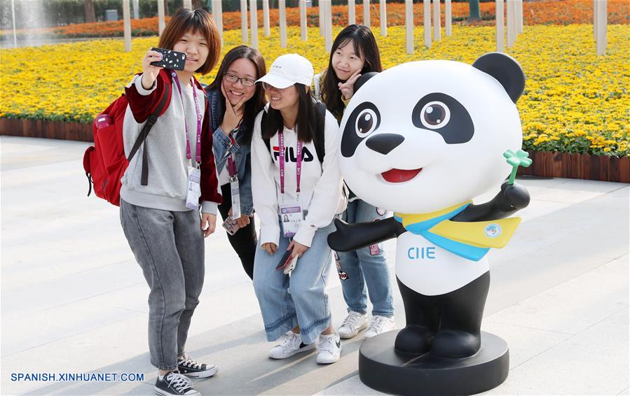 SHANGHAI, octubre 26, 2018 (Xinhua) -- Voluntarias para la próxima Exposición Internacional de Importaciones de China (CIIE, por sus siglas en inglés) posan con la mascota "Jinbao" frente al Centro Nacional de Convenciones y Exposiciones, en Shanghai, en el este de China, el 26 de octubre de 2018. El trabajo de colocación de los puestos de exhibición para la próxima Exposición Internacional de Importaciones de China (CIIE, por sus siglas en inglés) ha empezado en Shanghai, anunció el jueves el organizador. Más de 1,800 puestos de exhibición quedarán establecidos para fines de mes, antes de que los expositores comiencen a exhibir sus productos el 1 y 2 de noviembre, de acuerdo con el Buró de la Exposición Internacional de Importaciones de China. (Xinhua/Fang Zhe)