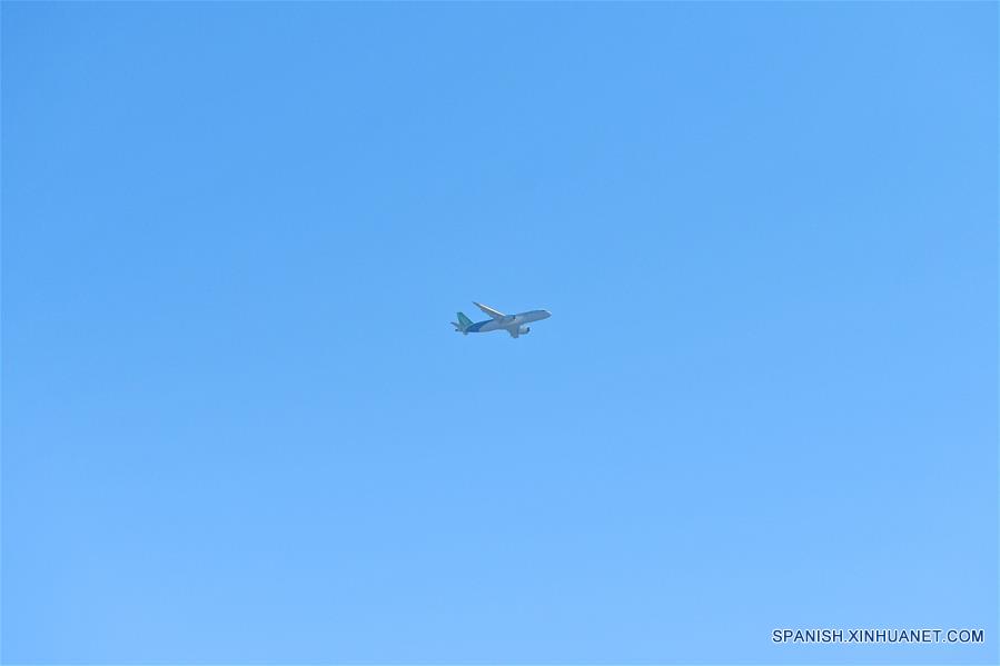 JIANGXI, octubre 27, 2018 (Xinhua) -- El avión grande de pasajeros C919 No.102 vuela sobre el Aeropuerto Yaohu de Nanchang, en la provincia de Jiangxi, en el este de China, el 27 de octubre de 2018. El avión avión C919 No.102 aterrizó en el Aeropuerto Yaohu de Nanchang después de un vuelo del Aeropuerto de Dongying Shengli de la provincia de Shandong, en el este de China. El avión será sometido a rigurosas pruebas en ese aeropuerto. (Xinhua/Hu Chenhuan)