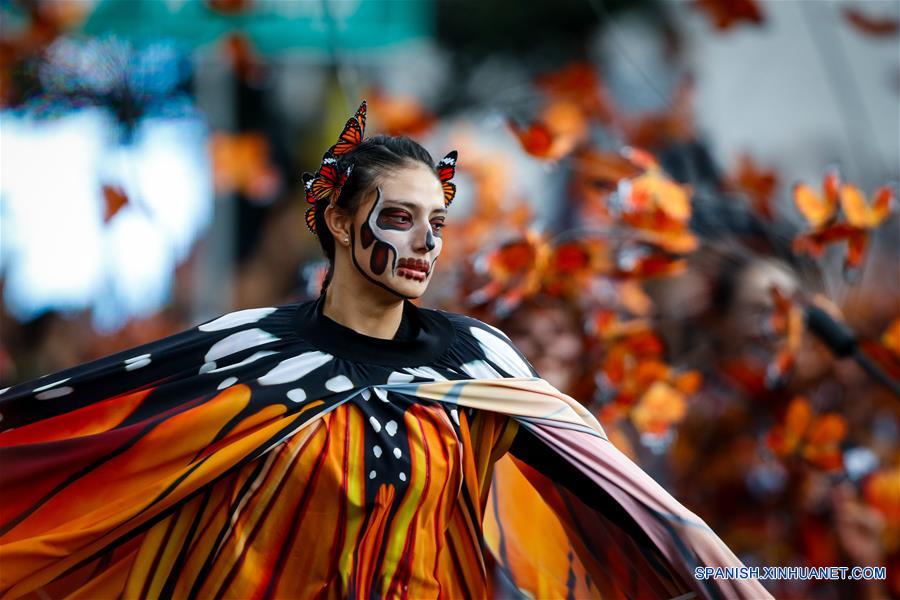 Una persona disfrazada participa en el Desfile de Día de Muertos 2018, en el marco de la celebración mexicana de Día de Muertos, en la Ciudad de México, capital de México, el 27 de octubre de 2018. De acuerdo con información de la prensa local, esta es la tercera edición del desfile, y comenzó en el monumento Estela de Luz y concluyó en el Zócalo de la capital de México. (Xinhua/Francisco Ca?edo)